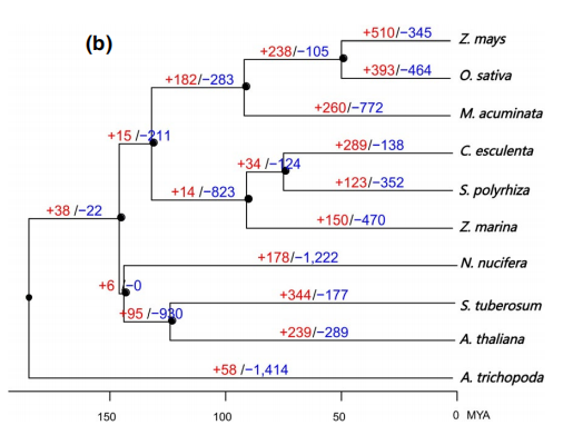 (8)全基因組復(fù)制事件加上前期已有研究物種或是研究較為清晰的物種作為比對(duì)(葡萄或無(wú)油樟可作為內(nèi)參)。