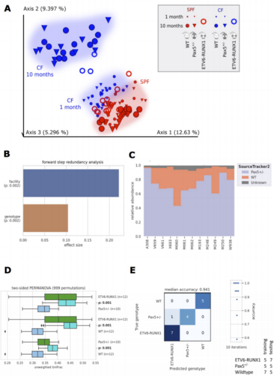 Sca1-ETV6-RUNX1小鼠在SPF組10個月時和CF組3~4個月時進(jìn)行微生物群分析。將這些數(shù)據(jù)與我們之前的分析相結(jié)合,證實了環(huán)境(設(shè)備)和基因型是形成腸道微生物群的關(guān)鍵因素(圖2A,B)。SourceTracker2分析表明,Pax5+/-微生物來源在Sca1-ETV6-RUNX1微生物群的組成中也很突出(圖2C),PERMANOVA分析結(jié)果證實,所分析的基因型形成的微生物群有統(tǒng)計學(xué)上的顯著差異(圖2D)。使用10個最重要的ASV(有1000棵樹的隨機(jī)森林),可以通過機(jī)器學(xué)習(xí)準(zhǔn)確地預(yù)測易感基因型(圖2E)。這些分析證實,在遺傳上易患PB-ALL的基因型都有不同的微生物群,獨立于外圍的B細(xì)胞有缺陷。