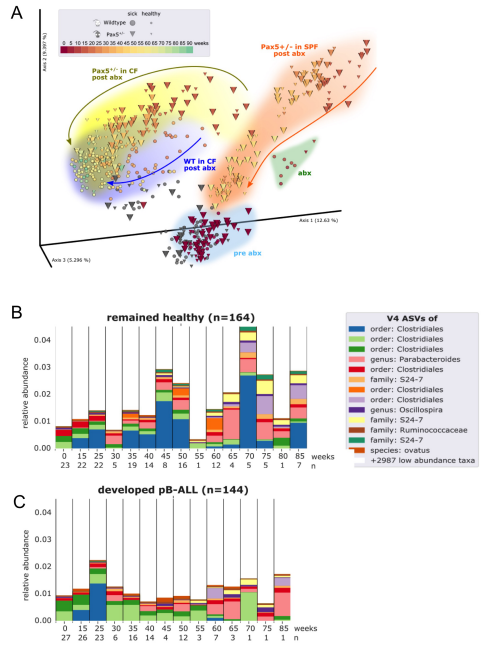 我們首先證實,抗生素治療后的微生物群落以一種依賴于基因型的方式再生,并且能夠隨著時間的推移而重建(圖5A)。接下來,我們將Pax5+/-發(fā)展為PB-ALL的小鼠的腸道微生物群與在整個實驗過程中保持健康的小鼠的腸道微生物群進(jìn)行了比較。通過對所有時間點應(yīng)用離散FDR,我們確定了3983個已鑒定的V4-ASV中的42個在白血病前期Pax5+/-小鼠(n=144,糞便樣本)和健康Pax5+/-小鼠(n=164,糞便樣本)之間差異豐富(圖5B,C)。這些發(fā)現(xiàn)將遺傳易感性和耗盡的微生物群與那些將患上感染驅(qū)動的PB-ALL的Pax5+/-小鼠聯(lián)系在一起。綜上所述,這些發(fā)現(xiàn)表明腸道微生物群有可能被用作早期生物標(biāo)記物來識別易患白血病的遺傳易感小鼠。