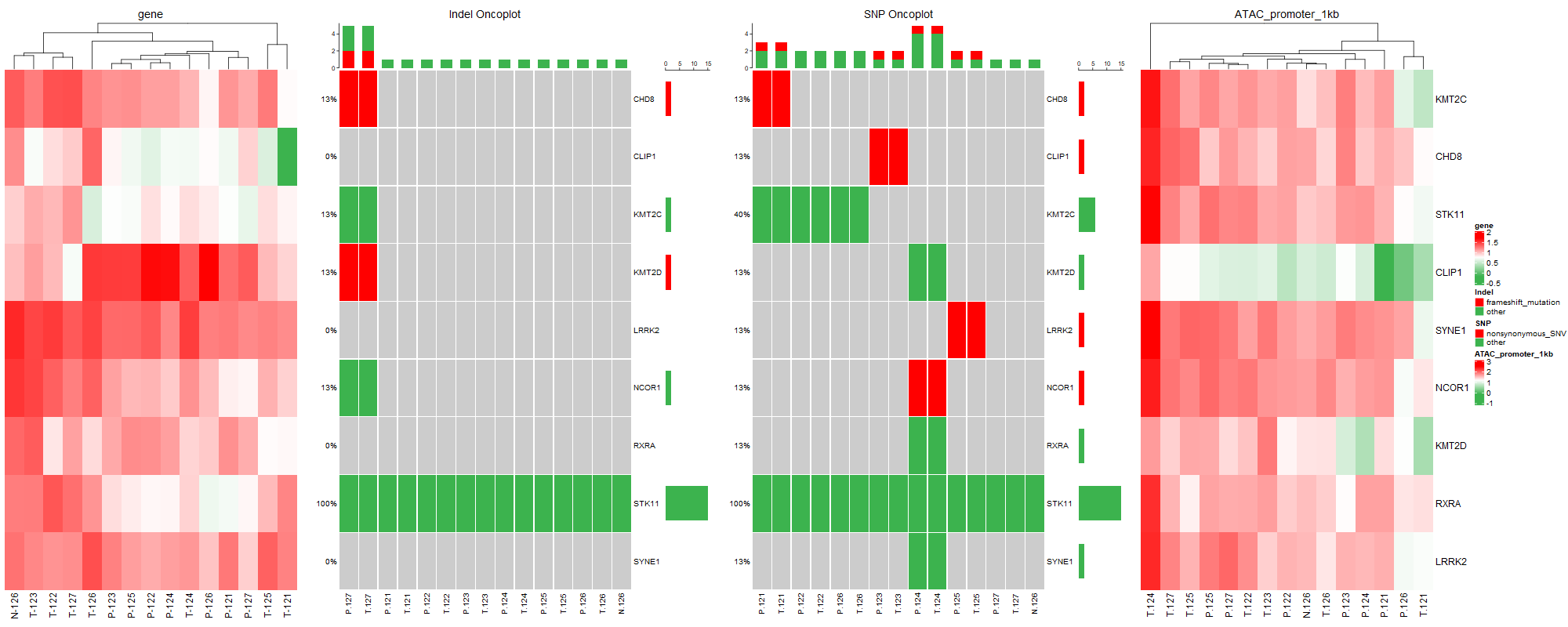 rownames(mat)<-mat$Gene mat<-mat[which(rownames(mat)%in%test$gene_symbol),] mat<-mat[,-1] mat[is.na(mat)]<-"" #mat<-str_replace("nonframeshift?insertion","other","") mat<-Replace(mat,from?=?"^.$",to?=?"",pattern?=?"") mat<-Replace(mat,from?=?"^,.",to?=?"",pattern?=?"") mat<-Replace(mat,from?=?",.$",to?=?"",pattern?=?"") mat<-Replace(mat,from?=?"^.,",to?=?"",pattern?=?"") mat<-Replace(mat,from?=?"stopgain",to?=?"other",pattern?=?"") mat<-Replace(mat,from?=?"stoploss",to?=?"other",pattern?=?"") mat<-Replace(mat,from?=?"unknown",to?=?"other",pattern?=?"") mat<-Replace(mat,from?=?"^synonymous?SNV$",to?=?"other",pattern?=?"") mat<-Replace(mat,from?=?"^nonsynonymous?SNV$",to?=?"nonsynonymous_SNV",pattern?=?"") mat<-Replace(mat,from?=?"synonymous?SNV,nonsynonymous?SNV",to?=?"nonsynonymous_SNV",pattern?=?"") mat<-Replace(mat,from?=?"nonsynonymous?SNV,synonymous?SNV",to?=?"nonsynonymous_SNV",pattern?=?"") #oncoPrint(mat) mat<-as.matrix(mat) #指定變異類型的標(biāo)簽,和數(shù)據(jù)中的類型對應(yīng) heatmap_legend_param<-list(title="SNP",at=c("nonsynonymous_SNV",?"other"),labels=c("nonsynonymous_SNV",?"other")) #設(shè)定標(biāo)題 column_title<-"SNP?Oncoplot" ht3<-oncoPrint(mat,alter_fun?=?alter_fun,col=col,column_title=column_title,heatmap_legend_param?=?heatmap_legend_param,remove_empty_columns?=?F,remove_empty_rows?=?F,show_column_names?=?T,show_row_names?=T) data<-?read.delim("ATAC_promoter_1kb.xls",?row.names?=?1,?header=TRUE?,check.names?=?F) row.names(data)<-data$gene_symbol data<-data[which(rownames(data)%in%test$gene_symbol),] data=?data[,?5:19] data[is.na(data)]<-0 data<-data[which(rowSums(data)>0),] data?<-?log10(data+0.000001) data<-as.matrix(data) library(ComplexHeatmap) color.1?<-?colorRampPalette(rev(c("red",?"white",?"#3CB34E")))(100) ht4<-Heatmap(data,col=color.1,cluster_columns??=?T,cluster_rows?=?F,name?=?"ATAC_promoter_1kb",column_title?=?"ATAC_promoter_1kb",show_row_names?=?T,show_column_names?=?T) draw(ht1+ht2+ht3+ht4,gap=unit(0.8,"cm")) dev.off()
