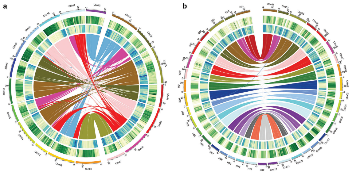 作者通過(guò)PacBio+BioNano+Hi-C+Illumina共組裝獲得530.8?Mb基因組(≈67%流式評(píng)估大??;≈77% survey評(píng)估大??;比對(duì)發(fā)現(xiàn)未裝出的為重復(fù)序列),contig N50=6.5?Mb,并將組裝的基因組序列掛載至19條假染色體上(掛載率97.23%;定序與定向率93.33%)(表1)。通過(guò)與二倍體C.sativus (CC)和C.hystrix(HH)染色體的C01–C07和H01–H12對(duì)應(yīng),將C.×hytivus染色體命名為Chc01–Chc07和Chh01–Chh12(圖1)。