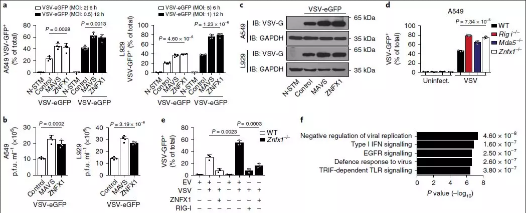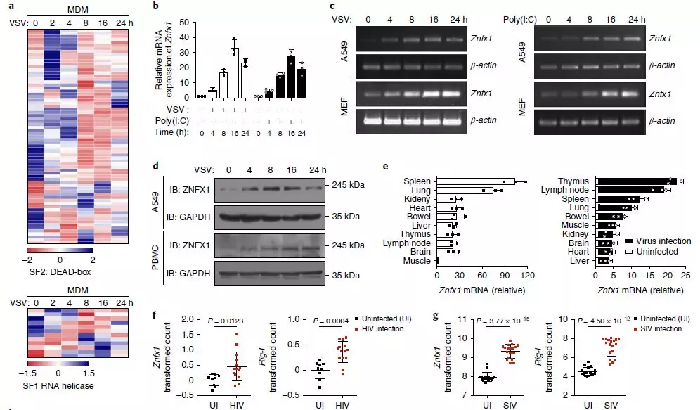 為了更深入地了解ZNFX1在抗病毒應(yīng)答中的作用,進行了qRT-PCR或免疫印跡分析,以了解VSV感染或干擾素誘導(dǎo)劑聚肌胞苷酸(poly(I:C))刺激A549細胞、外周血單個核細胞(PBMC)或小鼠胚胎成纖維細胞(MEF)細胞后ZNFX1的表達上調(diào)(圖1b–d)。qRT-PCR也證實了靜脈注射VSV后小鼠脾臟和肺中Znfx1的豐度上調(diào)(包括胸腺、淋巴結(jié)脾臟和肺)(圖1e)。作者還對先前收集的芯片數(shù)據(jù)集(GDS4231/4214/1271/3210/6082/6063)進行了統(tǒng)計分析,發(fā)現(xiàn)與健康對照相比,在HIV感染患者和猿猴免疫缺陷病毒(SIV)引起的腦炎猴子中,Znfx1的RNA水平明顯更高(圖1f,g)。此外,在不同的細胞類型(包括巨噬細胞、樹突狀細胞和上皮細胞)中感染病毒后,Znfx1的轉(zhuǎn)錄顯著增加。這些數(shù)據(jù)都表明ZNFX1可能是抗病毒分子。
