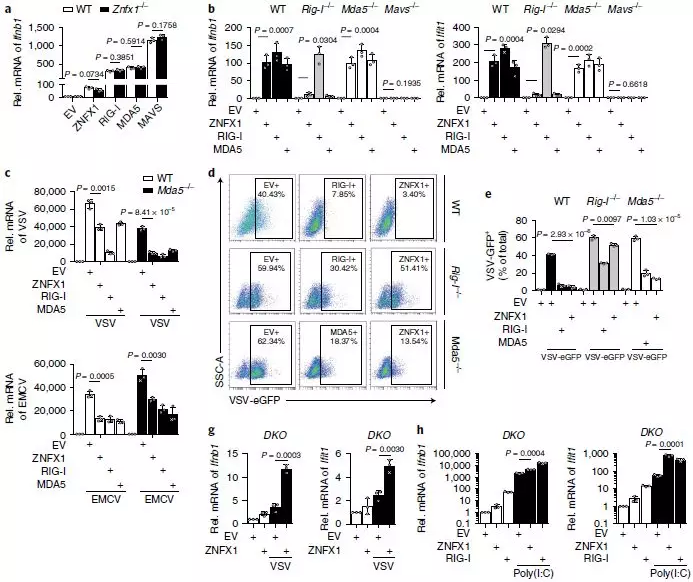 為了驗證ZNFX1在產(chǎn)生獨立于現(xiàn)有抗病毒傳感器RIG-1和MDA5的抗病毒免疫反應(yīng)中的作用,首先進行了共免疫沉淀試驗,發(fā)現(xiàn)ZNFX1在靜止或受VSV感染的細胞中既不與RIG-1也不與MDA5相互作用,qRT-PCR分析結(jié)果表明Znfx1缺乏并不影響RIG-1、MDA5和MAVS介導(dǎo)的Ifnb1表達的誘導(dǎo)(圖7a)。此外,過表達的ZNFX1可以強烈誘導(dǎo)野生型和Mda5-/-細胞中Ifnb1和Ifit1的mRNA表達,在Rig-I-/-細胞中略有誘導(dǎo),但在Mavs-/-細胞中則沒有效果(圖7b)。當(dāng)分別用ZNFX1、RIG-1和MDA5過表達質(zhì)粒轉(zhuǎn)染細胞時,Mda5-/-細胞中VSV和EMCV的病毒載量降低(圖7c)。同樣,F(xiàn)ACS分析表明,VSV-eGFP感染的野生型、Mda5-/-和Rig-I-/-細胞中的GFP+細胞百分比降低(7d,e)。通過進行poly(I:C)處理與否的Rig-I-/-A549細胞RNA-seq,觀察到ZNFX1的過表達增強了poly(I:C)刺激下Rig-I-/-A549細胞中IFN和ISG的誘導(dǎo)(圖7f)。分別用ZNFX1或RIG-I過表達質(zhì)粒轉(zhuǎn)染Znfx1和Rig-I雙敲除細胞(DKO)中VSV和poly(I:C)誘導(dǎo)的Ifnb1和Ifit1表達增強(圖7g,h)。此外,ZNFX1的siRNA敲低可以進一步增強Rig-I-/-細胞中VSV-eGFP的病毒載量(圖7i)。DKO細胞中VSVeGFP的病毒載量遠高于Rig-I-/-細胞中的病毒載量(圖7j)。所有這些結(jié)果表明ZNFX1無需依賴RLR(視黃酸誘導(dǎo)基因/RIG-1樣受體)即可發(fā)揮其抗病毒作用。