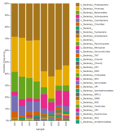物種豐度柱狀圖:每個(gè)柱子表示一個(gè)樣品,一種顏色代表一個(gè)物種,色塊長度表示物種所占相對(duì)豐度比例。通過物種分布柱狀圖即可以展示各樣品優(yōu)勢物種及組成,又可以清晰觀察到優(yōu)勢物種在不同樣品種的豐度變化趨勢。