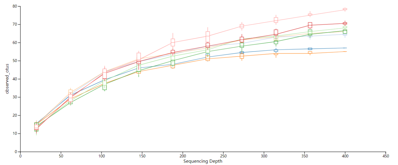 稀釋性分析:用于驗(yàn)證測序數(shù)據(jù)量是否足以反映樣品中的物種多樣性,并間接反映樣品中物種的豐富程度。在一定范圍內(nèi),隨著測序條數(shù)的加大,若曲線表現(xiàn)為急劇上升則表示群落中有大量物種被發(fā)現(xiàn);當(dāng)曲線趨于平緩,則表示此環(huán)境中的物種并不會(huì)隨測序數(shù)量的增加而顯著增多