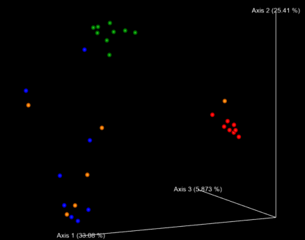 PCoA分析:原理是假設(shè)對(duì)N個(gè)樣品有衡量它們之間差異或距離的數(shù)據(jù),就可以用此方法找出一個(gè)直角坐標(biāo)系,將N個(gè)樣品表示成N個(gè)點(diǎn),而使點(diǎn)間的歐式距離的平方正好等于原來的差異數(shù)據(jù),實(shí)現(xiàn)定性數(shù)據(jù)的定量轉(zhuǎn)換,從多維數(shù)據(jù)中提取出主要的元素和結(jié)構(gòu)。