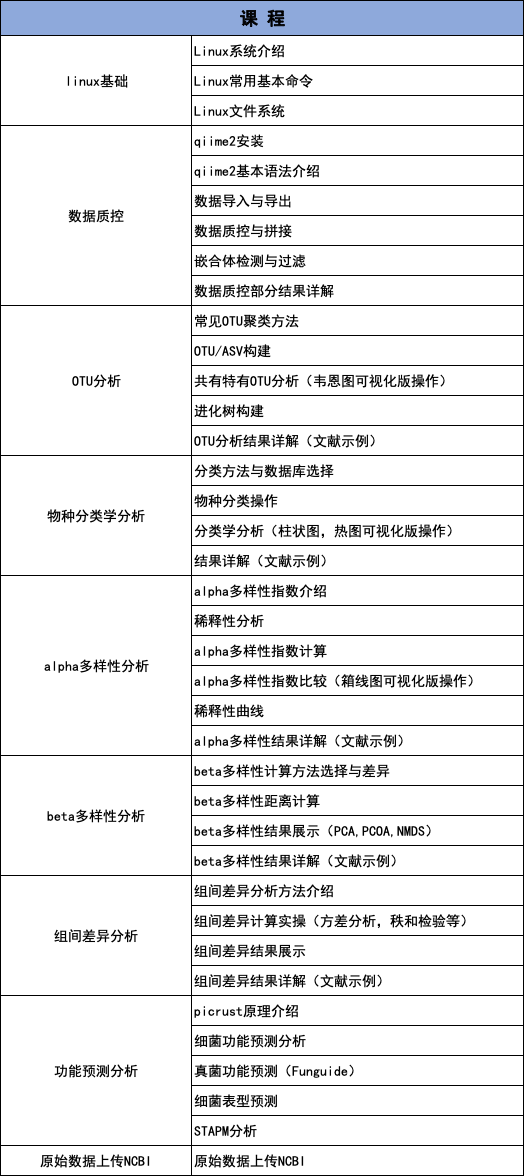 想學(xué)習(xí)如何分析微生物多樣性數(shù)據(jù)?想了解每步操作參數(shù)的意義?百邁客針對(duì)老師們對(duì)微生物多樣性內(nèi)容的需求,特開辦微生物多樣性生信課程,面向全體科研工作者,系統(tǒng)學(xué)習(xí)微生物多樣性分析中常規(guī)內(nèi)容與分析過程。課程設(shè)計(jì)覆蓋linux基本操作、QIIME2數(shù)據(jù)分析、百邁客云分析三部分內(nèi)容。