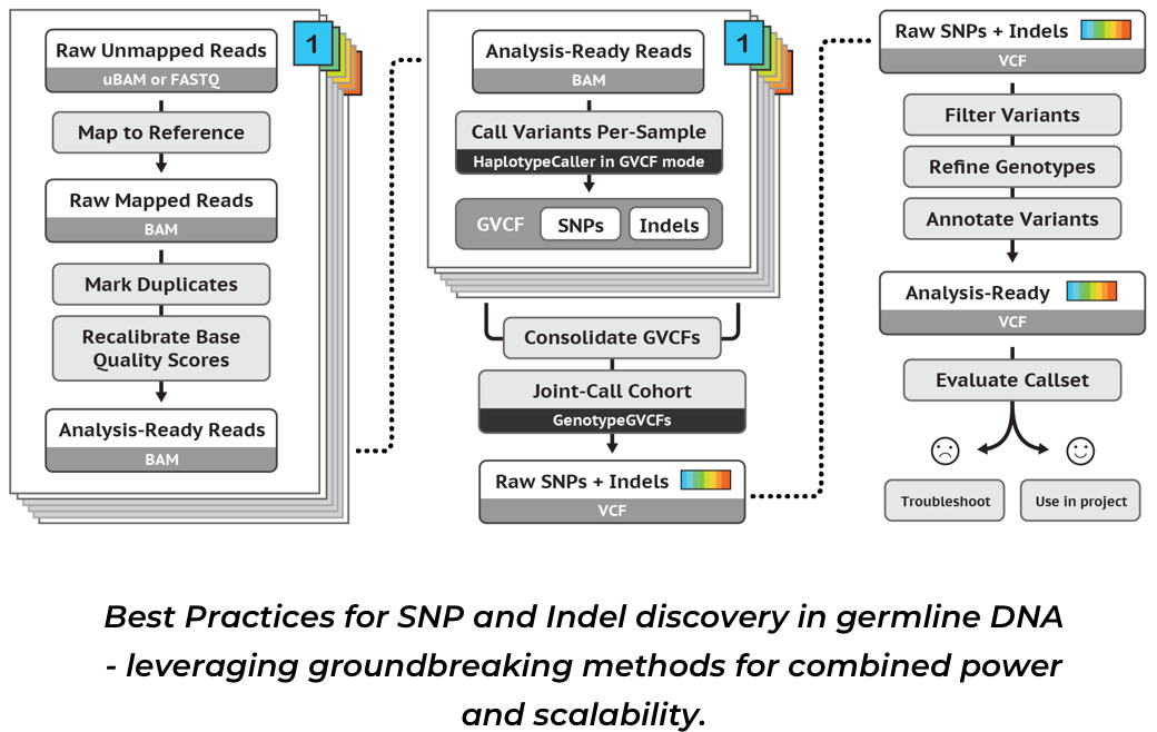 GATK全稱是The Genome Analysis Toolkit,是Broad Institute(The Broad Institute, formerly the Broad Institute of MIT and Harvard, evolved from a decade of research collaborations among MIT and Harvard scientists.)開發(fā)的用于二代重測(cè)序數(shù)據(jù)分析的一款軟件,里面包含了很多有用的工具,主要注重與變異的查找,基因分型且對(duì)于數(shù)據(jù)質(zhì)量保證高度重視。GATK是目前業(yè)內(nèi)使用較廣的基因數(shù)據(jù)變異檢測(cè)工具。本次課程基于GATK的Best?Practices,實(shí)現(xiàn)從原始的比對(duì)結(jié)果開始,到最終的高質(zhì)量突變位點(diǎn)的完整信息分析流程。