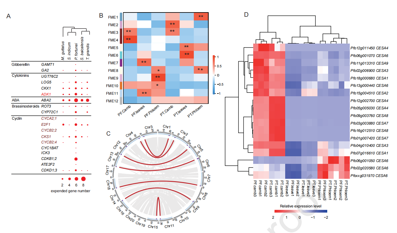 植物的形態(tài)發(fā)生和生長(zhǎng)速率可能歸因于細(xì)胞增殖和分裂、細(xì)胞壁形成以及光合效率或其他生物過(guò)程的增強(qiáng)。細(xì)胞分裂素生物合成中的四個(gè)基因家族和細(xì)胞周期調(diào)控中的十個(gè)基因家族,通過(guò)串聯(lián)基因復(fù)制或最近的WGD發(fā)生顯著擴(kuò)增(圖2A)。在泡桐屬植物中,白花泡桐(PF)的生長(zhǎng)速度遠(yuǎn)遠(yuǎn)快于毛泡桐(P. tomentosa,?PT)。約85%的毛泡桐基因cDNA可定位于白花泡桐基因組,因此對(duì)白花泡桐和毛泡桐的葉片、樹(shù)干韌皮部和樹(shù)干形成層進(jìn)行了比較轉(zhuǎn)錄組學(xué)分析。WGCNA分析得到12個(gè)潛在快速生長(zhǎng)相關(guān)ME(FME1~12),F(xiàn)ME3與毛泡桐和白花泡桐形成層的生長(zhǎng)發(fā)育相關(guān)(圖2B)。FME3模塊包括42個(gè)參與植物激素途徑或參與細(xì)胞周期調(diào)控的基因。FME4僅在白花泡桐中與形成層生長(zhǎng)和發(fā)育高度相關(guān)(圖2B),這個(gè)模塊中有五個(gè)基因與激素信號(hào)有關(guān),其中包括參與細(xì)胞分裂素代謝的腺苷激酶1,且這些基因在白花泡桐中顯著擴(kuò)增。通過(guò)基因的表達(dá)及拷貝數(shù)分析表明,CESAsCsls和木質(zhì)素生物合成基因可能在白花泡桐的發(fā)生中起作用(圖2D)。