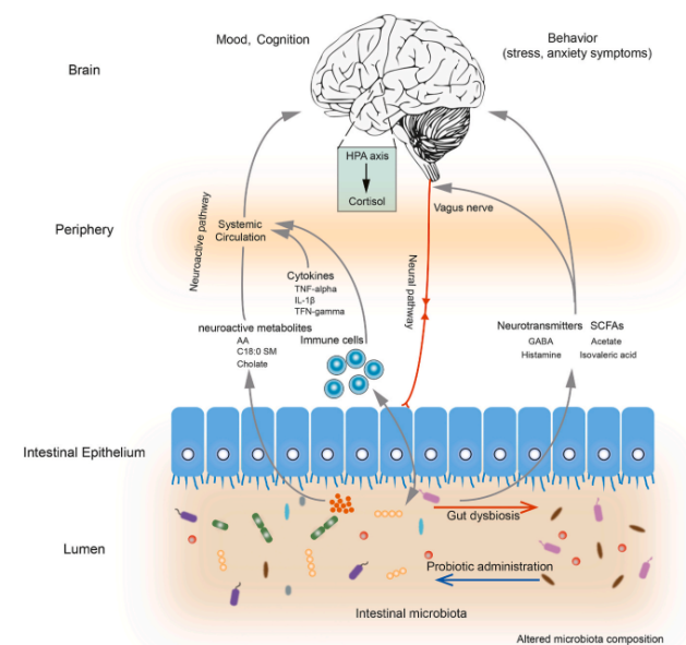 壓力在人們的生活中無處不在,嚴重的時候會引起人類焦慮甚至抑郁。目前抑郁影響著全球3億多人,每年有近80萬人因抑郁自殺身亡。最近的研究已經證明壓力會擾亂人類腸道微生物菌群的平衡,進而導致焦慮、抑郁等心理疾病。人類和腸道微生物的基因組溝通進化,導致腸道、腸道神經系統(tǒng)和中樞神經系統(tǒng)之間存在復雜的互作。腸道菌群參與各種激素、神經遞質的合成、釋放,其紊亂會導致壓力、焦慮、抑郁、帕金森疾病和阿爾茲海默癥。人類需要維持腸道微生物菌群平衡,從而保證身體健康。足量的益生菌可以與腸道菌群相互作用,使宿主保持心理健康。在這個過程中,益生菌調節(jié)宿主的腸道微生物群落,及某些神經活性化合物的合成、釋放。因此提出了基于益生菌治療某些神經和神經退行性疾病的療法。高質量的人類和動物相關研究表明,腸道微生物群在許多與壓力相關的情況中發(fā)揮著重要作用。然而,腸道微生物組在壓力相關條件下的因果關系和貢獻程度尚不清楚,本文旨在從腸道微生物組的角度闡明這種機制。