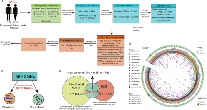 (a) 宏基因組組裝、分箱、構建和去重復的流程中產生了總共 589 個高質量SGB。(b) 589 個高質量 SGB 的系統(tǒng)發(fā)育位置。樹的熱圖顯示了在實驗期間 SGB 的每千堿基讀取數(shù) (RPKM) 的 log2 倍變化。(c) 在 589 個 SGB 中,分別有 539 個和 50 個之前培養(yǎng)過和未培養(yǎng)過。(d) 78 個SGB的新穎性。通過與 IGG 數(shù)據庫(16,136 個非冗余代表性人類腸道基因組的集合)和 Pasolli ?et al.?MAGs 數(shù)據庫(來自全球人口腸道和其他身體部位的 154,723 個非冗余基因組的數(shù)據集)的交叉比較發(fā)現(xiàn)都不匹配?(<95% average nucleotide similarity)?。