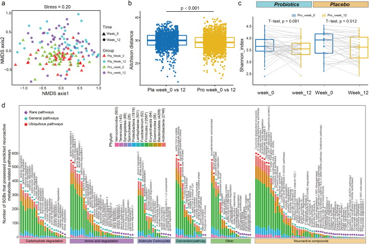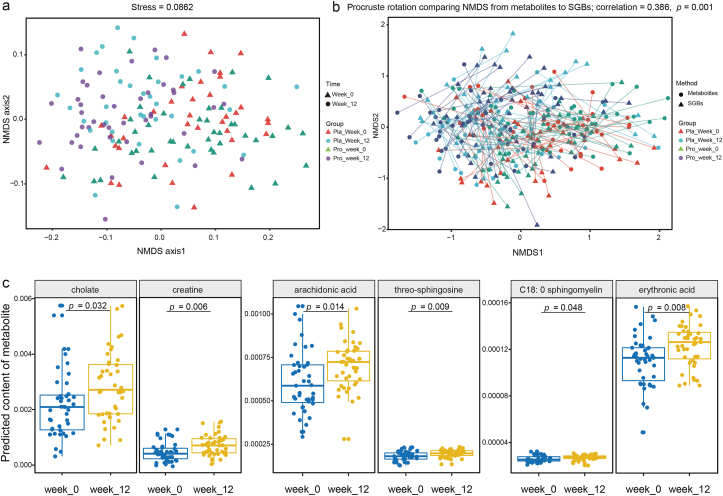 益生菌 (pro) 和安慰劑 (pla) 組在兩個時間點的預測腸道代謝組之間的差異。(a) 非度量多維標度(NMDS,Bray-Curtis 相似性指數(shù))和(b)對在第 0 周和第 12 周對兩組受試者的預測微生物組和代謝組進行了Procrustes 分析,表明顯示微生物組學和代謝組學特征之間的正協(xié)同性(correlation = 0.386;P??= 0.001)。(c) 益生菌組第 0 周和第 12 周之間預測的差異神經活性代謝物。p 值經 FDR 法校正,閾值 P < 0.05 表示顯著。