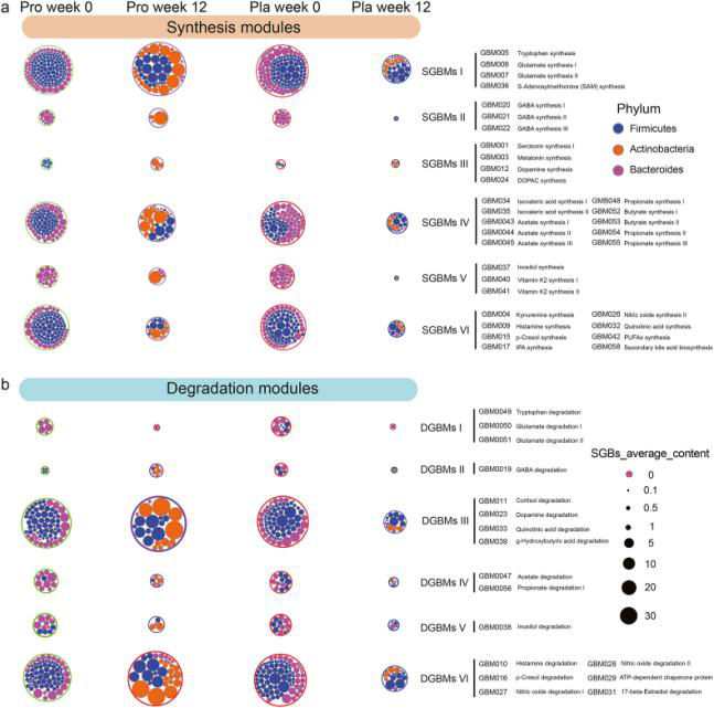 門級腸腦模塊 (GBM) 的分布。顯示了益生菌 (pro) 和安慰劑 (pla) 組中不同類型的 (a) 合成相關的GBM (SGBM) 和 (b) 降解相關的GBM (DGBM) 的分布及其在門水平上的組成。已鑒定的 SGBMs/DGBMs 根據其代謝物合成的預測功能分別分為六組(I 至 VI),并將它們相關的物種水平基因組箱(SGBs)分配給相應的門。外圈的大小代表相應 SGB 的平均豐度。