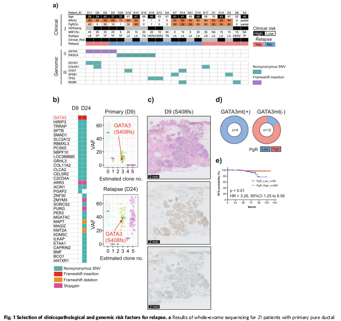 GATA3和PIK3CA突變是隊列中最常見的突變,分別出現(xiàn)在4例(19%)和5例(24%)患者中。在4例GATA3突變患者中,3例出現(xiàn)IDC復(fù)發(fā)。GATA3突變陽性與GATA3突變陰性復(fù)發(fā)的優(yōu)勢比(OR)為5.5(95%CI=0.63–76.7)。為了進(jìn)一步研究GATA3突變在復(fù)發(fā)中的意義,對復(fù)發(fā)腫瘤患者的樣本進(jìn)行額外分析,以確定與配對原發(fā)性DCI相比的突變狀態(tài)。