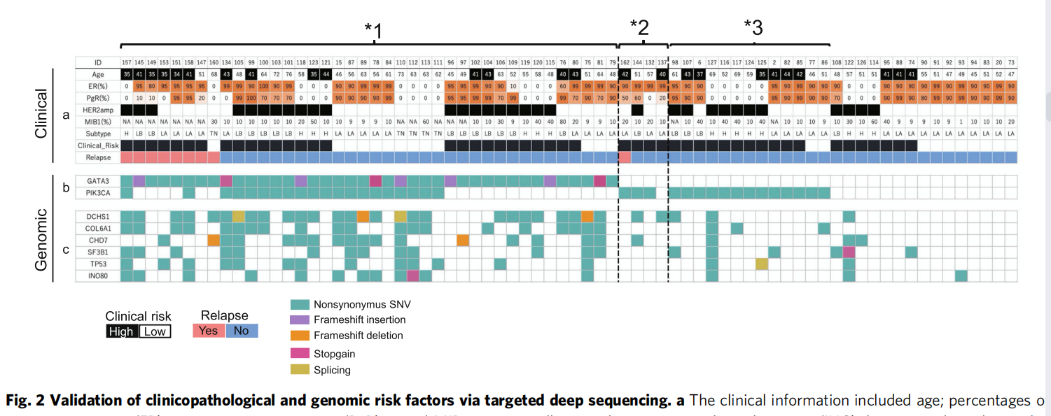 為了確定所識別的高危標(biāo)記物的分子病因,調(diào)查了另外三名具有代表性的新鮮冰凍標(biāo)本患者。患者A患有帶有GATA3突變(圖2,*1)和微侵襲的DCIS,病變被認(rèn)為是真正的DCIS?;颊連患有PgR低表達(dá)的DCIS(圖2,*2)和微侵襲,病變被視為真正的DCIS?;颊逤患有PIK3CA突變的DCIS(圖2,*3),沒有任何微侵襲,病變被認(rèn)為可能是假DCIS(低風(fēng)險DCIS)。