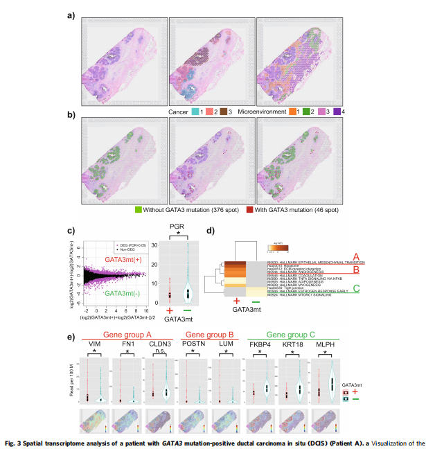 首先,利用空間轉(zhuǎn)錄組學(xué)技術(shù)——10X基因組學(xué)Visium平臺,通過STseq分析了患者A標(biāo)本的空間基因表達(dá)。該患者在術(shù)前病理診斷中被診斷為DCIS,但在術(shù)后病理診斷中發(fā)現(xiàn)有微侵襲部位。因此,DCIS病變被確定為IDC的真正前兆。平均深度為×2391.4的面板測序分析顯示該樣本含有GATA3突變(外顯子4:c.865dupG:p。C288fs,變異等位基因頻率[VAF]=7%)。在較高的VAF(外顯子5:c.T1035A:p。N345K,VAF=26.1%),表明新出現(xiàn)的GATA3突變用PIK3CA突變覆蓋了DCIS的基本特征。