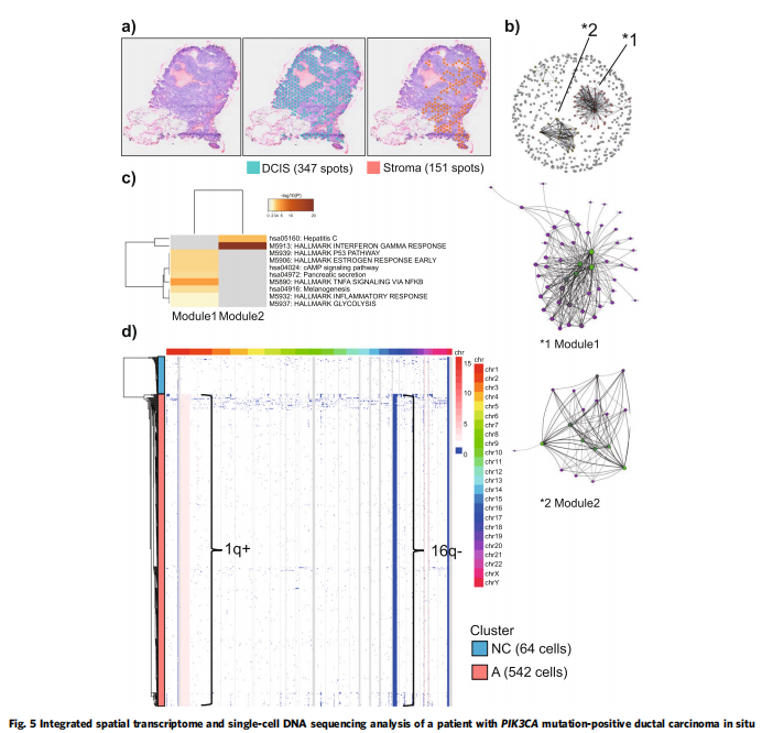 通過全外顯子組測序,平均深度為×134.8。Visium分析揭示了一種單調(diào)的基因表達(dá)模式,與該癌的形態(tài)學(xué)單克隆結(jié)構(gòu)一致(圖5a,左面板)。事實(shí)上,這些斑點(diǎn)通過非層次聚類大致分為兩個簇(圖5a,中間和右側(cè)面板)。它們幾乎與形態(tài)學(xué)確定的癌細(xì)胞和非癌細(xì)胞(基質(zhì)細(xì)胞)完全重疊。因此,使用DEG分析比較了癌細(xì)胞中的347個斑點(diǎn)(藍(lán)色斑點(diǎn))和基質(zhì)細(xì)胞中的151個斑點(diǎn)(橙色斑點(diǎn)),并確定了癌斑點(diǎn)中508個上調(diào)的DEG(FDR<0.05)。加權(quán)基因共表達(dá)網(wǎng)絡(luò)分析(WGCNA)顯示,與非癌點(diǎn)相比,癌點(diǎn)中只有兩個主要節(jié)點(diǎn)(模塊)發(fā)生改變(圖5b,上面板)。進(jìn)行了子網(wǎng)絡(luò)分析,以確定樞紐基因(圖5b,中間和下部面板)。hub基因的途徑富集分析顯示,參與雌激素反應(yīng)和p53途徑的基因在模塊1中富集(圖5c,補(bǔ)充數(shù)據(jù)5),這與在患者A和B中觀察到的良性出現(xiàn)斑點(diǎn)的特征相同,表明該病變中沒有發(fā)生惡性轉(zhuǎn)化。