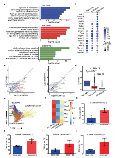 a HSC/MPP三個(gè)亞群的GO富集分析。b三種HSC/MPP亞型中富集的DEG的散點(diǎn)圖。c HSC/MPP1與HSC/MPP2(左)與 HSC/MPP3(右)中所有基因表達(dá)的散點(diǎn)圖。d箱線圖顯示了三種 HSC/MPP 亞型的 hscScore 分布。e軌跡分析重建HSC/MPP 到淋巴和骨髓祖細(xì)胞的譜系分化。f熱圖顯示了三種 HSC/MPP 亞型中HSC/MPP 特征基因和Cd93的表達(dá)模式。g使用 CD93 + SLAM-LSK (CD93 + HSC) 和 CD93 – HSC進(jìn)行初次移植后 8 周受者外周血 (PB) 中供體來源的嵌合體比例。h使用 CD93 + HSC 和 CD93 – HSC進(jìn)行初次移植后 20 周時(shí)受者 PB 中供體來源的嵌合體比例。i在使用 CD93 + HSC 和 CD93 – HSC進(jìn)行二次移植后 8 周時(shí)受者 PB 中的供體來源嵌合體比例。j使用 CD93 + HSC 和 CD93 – HSC進(jìn)行二次移植后 16 周時(shí)受者 PB 中供體來源的嵌合體比例。
