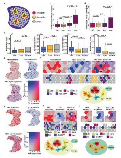 a點(diǎn)內(nèi)、點(diǎn)間及其他的示意圖。點(diǎn)內(nèi):HSC/MPP 定位點(diǎn);點(diǎn)間:HSC/MPP 包圍點(diǎn);其他,其他遠(yuǎn)端的點(diǎn)。b箱線圖展示點(diǎn)內(nèi)、點(diǎn)間和其他點(diǎn)中生態(tài)位細(xì)胞的富集分?jǐn)?shù)。c箱線圖展示了點(diǎn)內(nèi)生態(tài)位細(xì)胞的歸一化(富集)評(píng)分。d箱線圖顯示點(diǎn)間生態(tài)位細(xì)胞的歸一化(富集)評(píng)分。e FL中Ptn和Ptprs 的共表達(dá)模式。f 空間特征圖展示Ptn-Ptprs豐富的 HSC/MPP 擴(kuò)增單元?;騊tn在生態(tài)位細(xì)胞定位點(diǎn)(頂部,紅色點(diǎn))和基因Ptprs在HSC/MPP 定位點(diǎn)(頂部,藍(lán)色點(diǎn))的表達(dá)模式。g FL中Mdk和Lrp1 的共表達(dá)模式。h富含Mdk -Lrp1 的HSC/MPP 擴(kuò)增單元(點(diǎn)間)的空間特征圖。i空間特征圖展示富含Mdk- Lrp1 的HSC/MPP 擴(kuò)增單元(點(diǎn)內(nèi))。