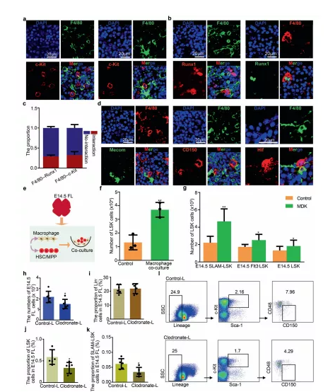 a免疫熒光分析顯示 E14.5 FL 冷凍切片中 F4/80(代表巨噬細(xì)胞)和 c-Kit(代表 HSCs/MPPs)的表達(dá)。b免疫熒光分析顯示 E14.5 FL 冷凍切片中 F4/80(代表巨噬細(xì)胞)和 Runx1(代表 HSCs/MPPs)的表達(dá)。C柱狀圖展示有和無細(xì)胞相互作用的 HSCs/MPPs 的比例。d免疫熒光分析顯示 E14.5 FL 冷凍切片中 F4/80(代表巨噬細(xì)胞)、CD150(代表 HSCs/MPPs)、Mecom(代表 HSCs/MPPs)和 Hlf(代表 HSCs/MPPs)的表達(dá)。f源自巨噬細(xì)胞和 HSC/MPP 共培養(yǎng)系統(tǒng)的 HSCs/MPPs(LSK 細(xì)胞)的數(shù)量。g源自MDK補(bǔ)充培養(yǎng)物的 100 個(gè) HSCs/MPPs(LSK、Flt3 -LSK 和 SLAM-LSK 細(xì)胞)的HSCs/MPPs(LSK 細(xì)胞)的數(shù)量。h氯膦酸鹽-脂質(zhì)體和對(duì)照-脂質(zhì)體處理后 E14.5 FL 中的總細(xì)胞數(shù)。i氯膦酸鹽處理前后 E14.5 FL中譜系- (Lin- ) 細(xì)胞的比例。j氯膦酸鹽處理前后 E14.5 FL 中 LSK 細(xì)胞的比例。k氯膦酸鹽處理前后 E14.5 FL 中 SLAM-LSK 細(xì)胞的比例。l流式細(xì)胞儀分析顯示E14.5 FL在氯膦酸鹽處理前后Lin -,LSK,SLAM-LSK的細(xì)胞比例。