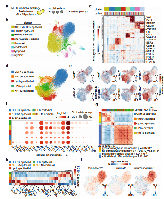 為了實(shí)現(xiàn)表征腫瘤內(nèi)異質(zhì)性的第一個(gè)目標(biāo),作者首先基于sn-RNAseq細(xì)胞類型比例研究了MIBC腫瘤的總體細(xì)胞組成(圖1a)。腫瘤由約90%的上皮細(xì)胞、5%的免疫細(xì)胞、3%的成纖維細(xì)胞和2%的內(nèi)皮細(xì)胞組成,這些細(xì)胞根據(jù)相應(yīng)的角蛋白、PTPRC、膠原蛋白、PECAM1、VWF等關(guān)鍵標(biāo)記基因(圖1b)。上皮間室無(wú)監(jiān)督聚類識(shí)別到了一個(gè)KRT13和KRT17差異表達(dá)的類群,KRT13、uroplakins(UPK)、KRT6A細(xì)胞周期相關(guān)基因類群,以及表達(dá)CDH12和其他上皮標(biāo)記物的細(xì)胞群(圖1d)。KRT13和UPK人群是僅有的兩個(gè)缺乏來(lái)自免疫浸潤(rùn)MIBC的基因標(biāo)記的人群,這表明在這些人群中富集的腫瘤代表免疫“冷”腫瘤(圖1e)。進(jìn)一步交叉參照傳統(tǒng)的尿上皮分化相關(guān)標(biāo)記表明,KRT13和UPK群體代表一個(gè)更分化的表型,而CDH12、KRT6A和cycle群體代表一個(gè)未分化或去分化的表型(圖1f)。如預(yù)期一樣KRT13和UPK群體表達(dá)了一個(gè)上皮細(xì)胞分化網(wǎng)絡(luò)(圖1g)。基于單細(xì)胞調(diào)控網(wǎng)絡(luò)推斷和聚類分析,預(yù)測(cè)CDH12群體表現(xiàn)出多種發(fā)育相關(guān)轉(zhuǎn)錄因子的高活性,包括NANOG、EOMES、PAX1和HOXD9(圖1h)。CDH12和循環(huán)群體在干-樣和神經(jīng)內(nèi)分泌基因標(biāo)簽得分也高(圖1i)。