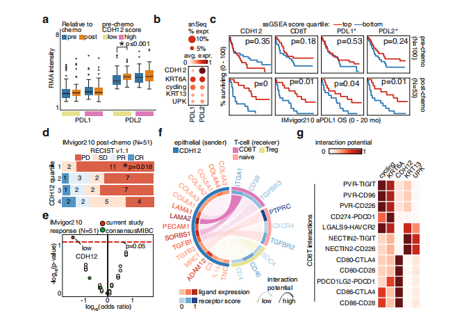 術(shù)前新輔助化療(NAC)和免疫檢查點(diǎn)治療(ICT)已經(jīng)徹底改變了膀胱癌的治療。然而,從這些模式中獲益最多的患者分層仍然是一個(gè)主要的臨床挑戰(zhàn)。作者將人類膀胱癌的單細(xì)胞核轉(zhuǎn)錄組、空間轉(zhuǎn)錄組和單細(xì)胞分辨率的空間蛋白組聯(lián)合分析,確定具有治療反應(yīng)預(yù)測(cè)能力的上皮細(xì)胞亞群。這些細(xì)胞表達(dá)Cadherin12(CDH12,N-Cadherin 2?)、catenins和其他上皮細(xì)胞的標(biāo)志物。CDH12富集的腫瘤可以定義患者是否接受NAC治療后預(yù)后效果差。富集CDH12的腫瘤對(duì)ICT表現(xiàn)出更好的效果。在所有情況下,通過(guò)對(duì)腫瘤CDH12富集進(jìn)行患者分層比目前膀胱癌亞型能更好的預(yù)后預(yù)測(cè)。CDH12群體類似于一種未分化的狀態(tài),具有固有的侵略性生態(tài)學(xué),包括化學(xué)耐藥性可能是通過(guò)祖細(xì)胞樣基因表達(dá)和成纖維細(xì)胞激活介導(dǎo)的。CDH12富集細(xì)胞表達(dá)PD-L1和PD-L2以及耗竭T細(xì)胞共定位,可能通過(guò)CD49a(ITGA1)介導(dǎo),為ICT在腫瘤中的功效提供一種解釋??傊?,本研究描述了一個(gè)對(duì)膀胱癌治療具有反向應(yīng)答的癌細(xì)胞群。重要的是還為臨床標(biāo)志物的篩選提供了一個(gè)令人信服的框架。