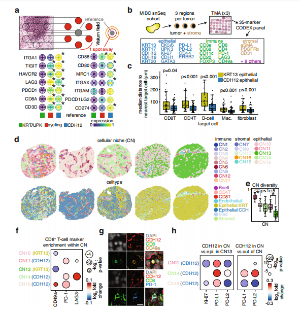 為了驗(yàn)證CDH12上皮細(xì)胞引起T細(xì)胞假說(shuō),作者使用Visium空間轉(zhuǎn)錄組和單細(xì)胞核轉(zhuǎn)錄組研究腫瘤中基因表達(dá)定位。CDH12富集的區(qū)域也富集了CD8T細(xì)胞marker和ITGA1(圖5a)。為了驗(yàn)證CDH12上皮細(xì)胞在單細(xì)胞水平上與T細(xì)胞共定位,作者設(shè)計(jì)并使用CODEX平臺(tái)對(duì)同一腫瘤隊(duì)列的腫瘤組織微陣列進(jìn)行了35位免疫組化檢測(cè)(圖5b)。