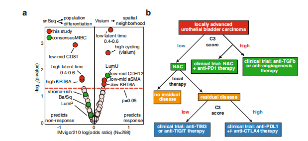 膀胱癌患者接受免疫治療后預(yù)后效果的好壞仍然是臨床上面臨的一個(gè)主要的挑戰(zhàn)。近期NC一篇文章通過(guò)單細(xì)轉(zhuǎn)錄組及空間轉(zhuǎn)錄組闡述了對(duì)膀胱癌治療具有反應(yīng)應(yīng)答的癌細(xì)胞群。獲得了在預(yù)測(cè)對(duì)免疫治療的反應(yīng)方面更優(yōu)的marker基因。有助于為患者的治療提供更理想更優(yōu)的治療方案。