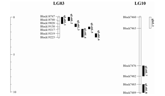 綠豆是豇豆屬中的主要栽培作物,也是我國(guó)重要的食用豆類。本研究對(duì)RIL群體及其親本進(jìn)行全基因組重測(cè)序,每個(gè)RIL系測(cè)序深度為4.54×,親本Dahuaye和Jilyu 9-1測(cè)序深度分別為20×和24×;利用劃bin策略進(jìn)行圖譜構(gòu)建,得到1946個(gè)bins,使用百邁客作圖軟件HighMap進(jìn)行圖譜構(gòu)建,總圖距為1060.17cM,平均圖距僅為0.54cM;與參考基因組共線性分析顯示,二者之間具有較高的共線性?;谠搱D譜,結(jié)合連續(xù)兩年的表型數(shù)據(jù),對(duì)缺刻葉和皺縮葉兩個(gè)葉形性狀進(jìn)行QTL分析;其中,缺刻葉性狀共檢測(cè)到8個(gè)QTL;皺縮葉性狀在兩個(gè)環(huán)境中均檢測(cè)到主效QTL。進(jìn)一步,對(duì)定位區(qū)間的候選基因及候選基因在兩親本間的SNP進(jìn)行了分析。