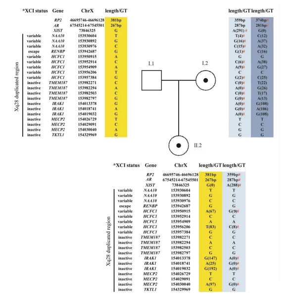 作者進行了基于PCR的AR和RP2分析,以評估外周血中的XCI模式。使用甲基化敏感的限制性內(nèi)切酶HpaII,使PCR只擴增非活性X染色體上的等位基因。通過分離分析確定了失活X染色體的起源。