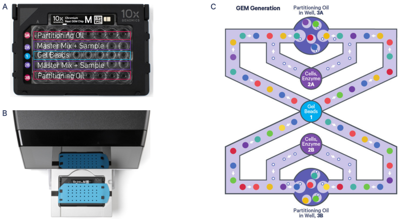 功能強(qiáng)大的單細(xì)胞Chromium X系統(tǒng)終于落地百邁客,也揭開其神秘的面紗。該系統(tǒng)依舊是在Next GEM的微流控原理基礎(chǔ)上,全程自動(dòng)化分選、捕獲、標(biāo)記數(shù)十萬個(gè)乃至百萬個(gè)單細(xì)胞微滴,并通過10x Barcode條形碼識(shí)別每一個(gè)微滴,從而實(shí)現(xiàn)了單個(gè)細(xì)胞基因表達(dá)檢測(cè)。