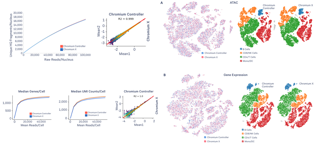 單細(xì)胞Chromium X系統(tǒng)可兼容單細(xì)胞系列產(chǎn)品,且與Controller系統(tǒng)數(shù)據(jù)保持極強(qiáng)的相關(guān)性。以下分別展示利用PBMCs捕獲10000個(gè)細(xì)胞/細(xì)胞核Chromium X和Controller系統(tǒng)的數(shù)據(jù)分析比較: