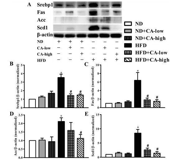 3.補充CA可調(diào)節(jié)高脂喂養(yǎng)小鼠脂肪生成相關(guān)蛋白表達