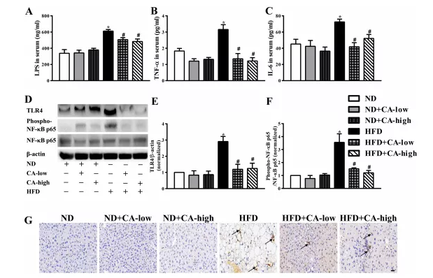 有報道稱,NAFLD的特征是腸道菌群改變、炎癥和腸道屏障破壞。肝組織炎癥被認為是肝脂肪變性發(fā)展的驅(qū)動因素,腸道源性脂多糖被認為在肝臟炎癥中具有致病作用。最近的動物實驗研究關(guān)注了腸道菌群LPS在NAFLD發(fā)生中的作用。腸道源性LPS是革蘭氏陰性菌外膜的主要成分,通過TLR4信號通路和下游炎癥級聯(lián)反應(yīng)促進炎癥反應(yīng)。有報道稱,在NAFLD模型中,與野生型小鼠相比,tlr4缺陷小鼠的肝損傷、炎癥和脂質(zhì)積累減少。此外,阻斷腸道菌群與宿主細胞之間的脂多糖- tlr4相互作用可以阻止高脂喂養(yǎng)小鼠NAFLD的啟動和發(fā)展,這證實了脂多糖- tlr4通路在誘導(dǎo)NAFLD中具有非常重要的作用。與之前的研究結(jié)果一致,我們的研究表明,16周高脂飲食導(dǎo)致血清LPS和肝臟TLR4表達顯著增加,肝組織中磷酸化的NF-kB p65被激活,表明炎癥開始。同時,高脂喂養(yǎng)小鼠血清TNF-a、IL-6水平升高,肝臟mpo陽性細胞浸潤。所有劑量的CA補充均顯著扭轉(zhuǎn)了上述現(xiàn)象;在添加ca的ND組中沒有觀察到顯著差異(圖4A-G)。