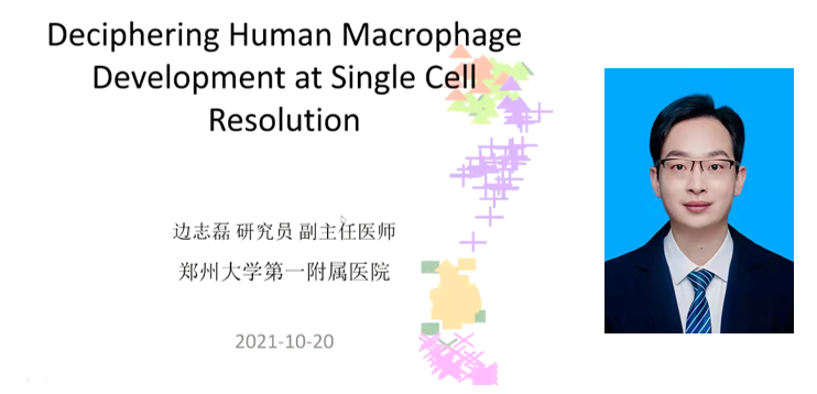 前面兩場報(bào)告湯老師和曹老師都是開發(fā)了單細(xì)胞空間新技術(shù),這些技術(shù)如何實(shí)現(xiàn)在臨床醫(yī)學(xué),特別是在腫瘤中精準(zhǔn)輔助治療應(yīng)用呢?鄭州大學(xué)第一附屬醫(yī)院血液科副主任醫(yī)師邊志磊研究員報(bào)告題目是:Deciphering human macrophage development at single-cell resolution,以超高單細(xì)胞分辨率深度解析了巨噬細(xì)胞發(fā)育。邊老師團(tuán)隊(duì)繪制了巨噬細(xì)胞在多個(gè)解剖部位的異質(zhì)性,并確定了不同的亞群,包括各種類型的胚胎組織駐留巨噬細(xì)胞(TRMs)(在頭部、肝臟、肺和皮膚)。追蹤了胚胎卵黃囊來源的原始巨噬細(xì)胞或卵黃囊衍生的偏髓性祖細(xì)胞(YSMPs)來源的胚胎肝單核細(xì)胞中TRM的發(fā)育軌跡,評(píng)估了胚胎期TRM和成年期TRM之間的分子相似性。全面描述了人類胚胎發(fā)生過程中早期巨噬細(xì)胞發(fā)育的時(shí)空動(dòng)態(tài)特征,為進(jìn)一步研究人類TRM的發(fā)育和功能提供了參考。