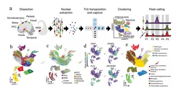 染色質(zhì)狀態(tài)通過調(diào)節(jié)基因調(diào)控元件(如增強(qiáng)子)的可及性來確定基因組的功能結(jié)構(gòu),這些元件是轉(zhuǎn)錄調(diào)節(jié)因子的結(jié)合位點(diǎn)。在發(fā)育過程中,轉(zhuǎn)錄因子的順序級聯(lián)逐漸重塑,并且不同細(xì)胞類型呈現(xiàn)出染色質(zhì)可及性的差異化。盡管染色質(zhì)的可及性是細(xì)胞特性的一個(gè)基本特征,但關(guān)于大腦發(fā)育過程中染色質(zhì)狀態(tài)變化的研究相對較少。目前單細(xì)胞基因組學(xué)已經(jīng)能夠使用scATAC-seq以細(xì)胞分辨率對染色質(zhì)狀態(tài)進(jìn)行可伸縮分析。在發(fā)育中的小鼠大腦中,scATAC-seq揭示了作為神經(jīng)發(fā)育過程基礎(chǔ)的染色質(zhì)可及性的高度動(dòng)態(tài)變化。有必要將這些研究擴(kuò)展到人類初級組織,以便更好地了解非編碼調(diào)控元件(包括人類特有的神經(jīng)發(fā)育增強(qiáng)子)的突變?nèi)绾胃蓴_正常的發(fā)育過程,并導(dǎo)致精神神經(jīng)發(fā)育障礙的遺傳基礎(chǔ)。