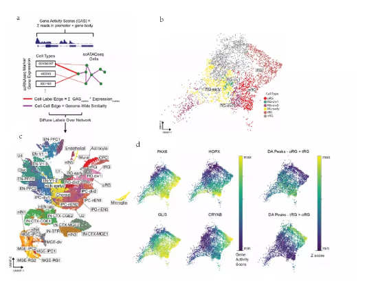 使用基因活性分?jǐn)?shù)來區(qū)分細(xì)胞類型,鑒定了多種主要的細(xì)胞類型,包括放射狀膠質(zhì)細(xì)胞(RGS)、中間前體細(xì)胞(IPC)、深層(皮質(zhì)V-VI層)興奮性神經(jīng)元(dlENs)、上層(皮質(zhì)II-IV層)興奮性神經(jīng)元(UlENs)、MGE和CGE來源的皮質(zhì)中間神經(jīng)元(分別為IN-MGES和IN-CGES)、胰島神經(jīng)元、MGE的前體細(xì)胞、小神經(jīng)膠質(zhì)細(xì)胞、少突膠質(zhì)前體細(xì)胞(OPCs)、內(nèi)皮細(xì)胞以及壁細(xì)胞。此外,結(jié)合scRNA-seq數(shù)據(jù),使用CellWalker將scATAC-seq細(xì)胞與細(xì)胞類型匹配。CellWalker以更精細(xì)的分辨率識別細(xì)胞類型和更廣泛的細(xì)胞亞型。此外,作者可以在兩種亞型(TRGS和ORGS)之間識別出不同的開放區(qū),這兩種亞型分別表達(dá)CRYAB和HOPX,這表明scATAC-seq能夠在高分辨率下區(qū)分細(xì)胞亞型,具有更高的靈敏度。