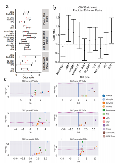 不同發(fā)育階段和分化狀態(tài)的染色質(zhì)狀態(tài)的細(xì)胞分辨率數(shù)據(jù)可能提供突變和發(fā)育中的不同細(xì)胞類型選擇性脆弱性之間的聯(lián)系。為此,研究者將特定細(xì)胞類型的ATAC-seq peaks和預(yù)測的增強(qiáng)子與疾病相關(guān)的常見和罕見的非編碼突變體記性關(guān)聯(lián)分析。首先分析了細(xì)胞類型特異性的peaks sets、預(yù)測的增強(qiáng)子、啟動(dòng)子相互作用區(qū)域與基因組區(qū)域重疊的peaks值,這些區(qū)域在發(fā)育遲緩的個(gè)體中富集了拷貝數(shù)變異;結(jié)果發(fā)現(xiàn)dlEN、內(nèi)皮/壁層和小神經(jīng)膠質(zhì)細(xì)胞特異性peaks顯著富集,以及中間神經(jīng)元中重疊啟動(dòng)子相互作用區(qū)的peaks顯著富集。