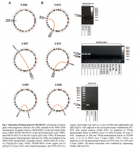 HAMLET提供了融合轉(zhuǎn)錄物的詳細(xì)信息,包括差異剪接(KMT2A-MLLT3、RUNX1-RUNX1T1、PML-RARA、CBFB-MYH11和NUP98-NSD1)和來(lái)自平衡易位的相互轉(zhuǎn)錄物,例如,RARA-PML, ERG-FUS, NUP214-DEK, 和 NSD1-NUP98??傊?,HAMLET檢測(cè)到54種不同的融合轉(zhuǎn)錄本,這些轉(zhuǎn)錄物不能通過(guò)中期核型分析預(yù)測(cè)??偟膩?lái)說(shuō),28例急性髓系白血病攜帶兩個(gè)或多個(gè)融合,在一個(gè)復(fù)雜的AML中*多有9個(gè)不同的融合基因。