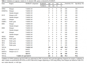 HAMLET的VARSCAN組件在13個(gè)AML基因中鑒定出246個(gè)小變異體。HAMLET對(duì)NPM1和DNMT3A的FLT3-ITD和熱點(diǎn)區(qū)域進(jìn)行了敏感性評(píng)估,對(duì)其余的418個(gè)被HAMLET稱(chēng)為野生型的樣本進(jìn)行了靶向重測(cè)序反應(yīng)。VARSCAN只識(shí)別了七個(gè)相當(dāng)短的FLT3-34人中的ITDFLT3-ITD攜帶AML。在這種情況下,HAMLET都正確地識(shí)別了一個(gè)ASXL1(3-030)的30bp C末端插入和CEBPA (3-003)中一個(gè)N端易位。HAMLET檢測(cè)到的小變異體的總體類(lèi)型和分布與在COSMIC中報(bào)告的分布非常一致。