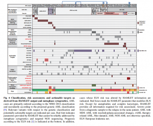 根據(jù)HAMLET和中期核型分析結(jié)果,99例病例可根據(jù)世衛(wèi)組織2016年和基因組分類(lèi)進(jìn)行重新分類(lèi)(圖6)。HAMLET信息促進(jìn)了6個(gè)案例的風(fēng)險(xiǎn)重新評(píng)估,值得注意的是通過(guò)NUP98-NSD1融合而無(wú)分類(lèi)明確病變的AML,或通過(guò)EVIl過(guò)表達(dá)而無(wú)inv(3)(q21q26)來(lái)分配風(fēng)險(xiǎn)。