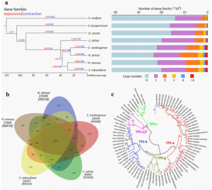 物種演化過程中,往往伴隨著基因家族的擴(kuò)張與收縮,基因家族(gene family)是來源于同一個(gè)祖先,由一個(gè)基因通過基因重復(fù)而產(chǎn)生兩個(gè)或更多的拷貝而構(gòu)成的一組基因,它們在結(jié)構(gòu)和功能上具有明顯的相似性,編碼相似的蛋白質(zhì)產(chǎn)物。而特定基因家族的擴(kuò)張可能在促進(jìn)植物表型多樣化和新性狀進(jìn)化中發(fā)揮重要作用。通過與具有相似/相反生物學(xué)功能的近緣物種比較,獲得相關(guān)基因家族,并將選擇其中某種擴(kuò)張基因家族聯(lián)合轉(zhuǎn)錄組差異表達(dá)以及代謝組,可以深度挖掘目的物種重要性狀形成機(jī)制與重要代謝通路。該研究方法是中藥、花卉、蔬果等植物研究中的重要環(huán)節(jié)。