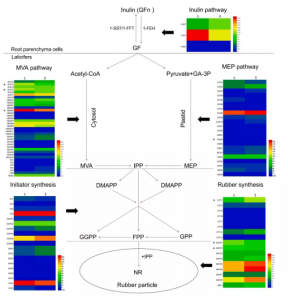 橡膠草(Taraxacum kok-saghyz,TKS)是一種小型、二倍體、有性生殖、蓮座狀多年生植物。它屬于菊科植物,起源于中國和哈薩克斯坦的天山山區(qū)。TKS的根部可以產生大量的天然橡膠(Natural rubber,NR)(高達20%干重),其分子量與巴西橡膠樹相似。TKS具有種植面積廣、NR含量和質量高、易于種植和收獲、成熟時間短等優(yōu)點,因此TKS是一種具有商業(yè)前景的優(yōu)質NR替代源。然而,高雜合度和自交不親和導致的近交衰退是將TKS培育成NR生產作物的嚴重挑戰(zhàn)。更好地理解NR生物合成途徑和相關基因,以及TKS中相互競爭的代謝途徑,將有助于選擇合適的經(jīng)典或生物技術育種策略來改善TKS培育。迄今為止,許多與NR生物合成相關的基因已在TKS和其他NR生產植物中被鑒定。TKS基因組組裝于2017年構建,鑒定出40個屬于MVA途徑的基因、19個參與起始劑合成的基因和20個參與NR合成的基因。然而,關于TKS中NR生物合成的分子機制的知識仍然是不完整和難以捉摸的。