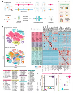 在該課題的研究人員收集了來(lái)自22例TNBC患者(11例接受阿替利珠單抗聯(lián)合紫杉醇化療,11例接受紫杉醇單藥化療)治療前和治療后的78例配對(duì)樣本,通過(guò)整合單細(xì)胞轉(zhuǎn)錄組測(cè)序、T細(xì)胞受體序列測(cè)序和染色質(zhì)可及性測(cè)序,構(gòu)建了TNBC患者腫瘤微環(huán)境和外周血來(lái)源免疫細(xì)胞的高分辨率轉(zhuǎn)錄組和表觀組動(dòng)態(tài)圖譜。該研究在單細(xì)胞水平上對(duì)來(lái)自接受兩種治療方案的TNBC病人的腫瘤組織和外周血的免疫細(xì)胞動(dòng)態(tài)分析,系統(tǒng)比較了應(yīng)答患者和非應(yīng)答患者的腫瘤微環(huán)境及外周血免疫特征,闡明了免疫細(xì)胞在不同治療方案下的動(dòng)態(tài)變化,揭示了anti-PD-L1免疫治療聯(lián)合紫杉醇化療在TNBC中的作用機(jī)制。