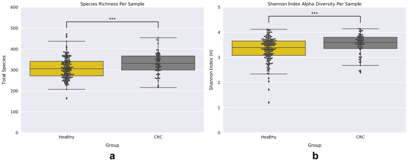 使用基于em的方法計算每個樣本內(nèi)物種的相對豐度,以構(gòu)建一個樣本分類單元矩陣,通過測量每個樣本的細(xì)菌豐富度和Shannon指數(shù),利用該矩陣探究兩個樣本組(健康和晚期CRC)的微生物多樣性。CRC組的樣本顯示出更大的多樣性,包括豐富度和Shannon指數(shù)(Mann-Whitney U檢驗:MWU);豐富度:MWU pvalue = 0.0005, Shannon指數(shù):MWU pvalue = 0.0009)(圖一a,b)。由于物種多樣性的量度對物種均勻度和豐富度的敏感性不同,還應(yīng)用了辛普森指數(shù)來計算樣本組內(nèi)的物種多樣性,這些結(jié)果與之前的分析一致,CRC樣本中的物種多樣性與健康樣本中的物種多樣性有顯著性差異(MWU值= 0.0238).