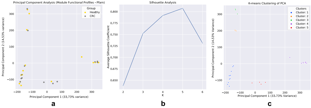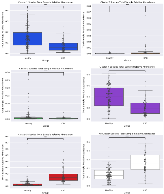 通過構(gòu)建CLR轉(zhuǎn)換的模塊功能來比較模塊的潛在功能。模塊功能(蛋白域)圖譜的PCA顯示出較大的差異(PC1: 33.73%,PC2: 14.53%),模塊似乎形成包含兩組代表的簇團(圖 5a)。為了定義模塊的聚類,進(jìn)行了輪廓分析,估計五個聚類作為用于K-均值聚類的最*K值(圖?5b)。通過K-均值聚類定義模塊聚類后(圖?5c)對這些集群進(jìn)行了分類分析。在整個網(wǎng)絡(luò)中,同一集群內(nèi)的模塊被發(fā)現(xiàn)在分類學(xué)上是相似的,不包括簇1和簇5,簇1和簇5顯示出物種占有的變化,其中在健康網(wǎng)絡(luò)的簇1內(nèi)發(fā)現(xiàn)的一些物種被顯示在CRC組的簇5內(nèi)。然而,兩個網(wǎng)絡(luò)對在簇2、3和4中發(fā)現(xiàn)的物種有很強的一致性。第2組中的物種僅有“致病菌”(即通常無害但在特定環(huán)境條件下具有致病能力的物種)口腔微生物,而簇3主要是鏈球菌種和簇4主要類桿菌種。隨后,進(jìn)行聚類功能分析以發(fā)現(xiàn)蛋白質(zhì)結(jié)構(gòu)域,以及蛋白質(zhì)家族的主要作用和次要作用,這使得聚類在功能上不同。簇1的功能與細(xì)胞表面粘附、對抗沖突策略、酪氨酸重組酶、多糖降解、糖胺聚糖結(jié)合、腫瘤蛋白酶抑制、過氧化物酶功能、碳水化合物/纖維素結(jié)合活性和氨基酸生物合成相關(guān)。簇2的功能涉及對宿主細(xì)胞和細(xì)胞外基質(zhì)的粘附、細(xì)胞感染、膠原結(jié)合、補體抗性、鳥氨酸/賴氨酸/精氨酸脫羧酶(組織腐敗/多胺合成/酸性環(huán)境抗性)、金屬肽酶、V型分泌系統(tǒng)、氨的產(chǎn)生和有毒金屬離子的排泄(銅流出系統(tǒng))、細(xì)胞包膜、DNA代謝、脂肪酸和磷脂代謝、表面多糖和脂多糖的生物合成和降解。簇3的功能與粘蛋白結(jié)合、鋅清除/吸收、細(xì)胞表面粘附、葡萄糖結(jié)合/轉(zhuǎn)運和銅結(jié)合、蛋白質(zhì)和肽的命運/合成/分泌、多糖/碳水化合物、有機醇和酸的降解方面有關(guān)。簇4的功能涉及金屬結(jié)合、二瓜氨酸環(huán)化酶/磷酸二酯酶、群體感應(yīng)、碳水化合物結(jié)合和半胱氨酸/木瓜蛋白酶、核苷和核苷酸、轉(zhuǎn)運和結(jié)合蛋白、TCA循環(huán)、鐵攜帶以及表面多糖的降解和生物合成。最后簇5的區(qū)別功能與氨肽酶、三羧酸受體、乙醇胺轉(zhuǎn)運、淀粉利用、木葡聚糖/多糖結(jié)合、能量代謝、氨基酸和胺、陽離子和鐵化合物、電子轉(zhuǎn)運以及表面多糖和脂多糖的生物合成和降解相關(guān)。檢查了在每個集群內(nèi)發(fā)現(xiàn)的用于網(wǎng)絡(luò)構(gòu)建的物種的豐度(健康:簇1 (33%)、簇2 (2%)、簇3 (5%)、簇4 (26%)、簇5 (7%)、無(27%);CRC:簇1 (19%)、簇2 (3%)、簇3 (3%)、簇4 (12%)、簇5 (30%)、無(33%)(圖6)。我們的發(fā)現(xiàn)表明,與健康組相比,在CRC中,第2類和第5類組模塊中發(fā)現(xiàn)的物種總數(shù)增加,第1類、第3類和第4類組中發(fā)現(xiàn)的物種減少。這些結(jié)果也反映在我們發(fā)現(xiàn)的總樣本相對豐度的統(tǒng)計顯著變化中,即群內(nèi)物種在群間所占的比例(第一組: MWU值= 4.29 e-12;第二組:MWU值= 3.16 e-16;第三組:MWU值= 0.0002;第四組:MWU值= 2.62-13;第五組:MWUp值= 2.81 e-29;無集群物種:MWU值= 4.40-17(圖7)。此外,發(fā)現(xiàn)網(wǎng)絡(luò)內(nèi)的大多數(shù)負(fù)面關(guān)聯(lián)(健康:100%,CRC:96%)發(fā)生在占據(jù)不同集群類型內(nèi)模塊的物種之間。只有在CRC中,簇1的物種之間才出現(xiàn)集群內(nèi)的負(fù)相關(guān),其中物種種類和豐度也顯示出減少。