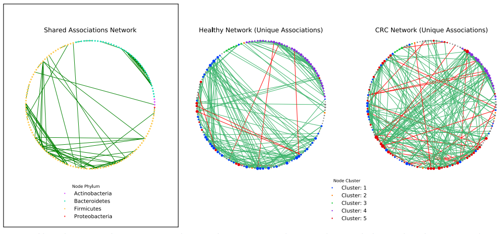 群體網(wǎng)絡(luò)包含相似的關(guān)聯(lián)權(quán)重分布,正相關(guān)比負(fù)相關(guān)更多(圖4a)。值得注意的是,與健康網(wǎng)絡(luò)相比,CRC包含更多的負(fù)相關(guān)。29%的負(fù)相關(guān)涉及一種被認(rèn)為是口腔微生物的物種,而在健康網(wǎng)絡(luò)中,沒有發(fā)現(xiàn)涉及口腔菌群。在網(wǎng)絡(luò)中發(fā)現(xiàn)的大多數(shù)關(guān)聯(lián)是該網(wǎng)絡(luò)獨有的(健康:69%,CRC:72%)(圖4b)。我們假設(shè)群落結(jié)構(gòu)的這種巨大差異可以反映生態(tài)系統(tǒng)的變化,并進(jìn)而分析了網(wǎng)絡(luò)中物種之間的分類關(guān)系(圖4c)。兩個網(wǎng)絡(luò)在同一屬內(nèi)的物種(健康:MCS pvalue= 0.00099,CRC:MCS pvalue= 0.00099)和家族(健康:MCS值= 0.00099,CRC:MCS= 0.00099 )。然而,只有在健康組的網(wǎng)絡(luò)中,物種與來自同一順序的其他物種的積極相關(guān)仍然明顯多于隨機相關(guān)(健康:MCS pvalue= 0.00099,CRC: MCS pvalue = 0.44)。與健康網(wǎng)絡(luò)(健康:4%,CRC:17%)相比,CRC的網(wǎng)絡(luò)在分類上的遠(yuǎn)緣關(guān)系中顯示出更大的豐度,在健康網(wǎng)絡(luò)中分類上的遠(yuǎn)緣微生物之間的正關(guān)聯(lián)仍然顯著較少(門內(nèi):MCS值= 0.00099,門外:MCSp值= 0.00099)和CRC(門內(nèi):MCS pvalue= 0.00099,門外:MCS pvalue= 0.00099)而不是隨機網(wǎng)絡(luò)。