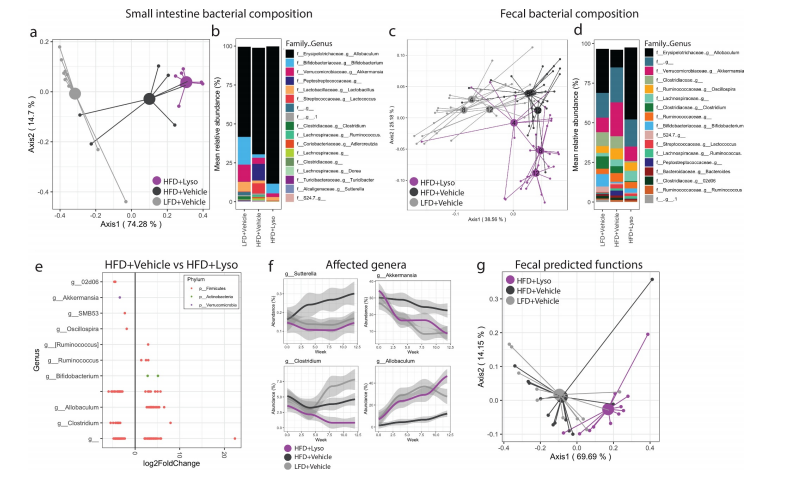 由于微生物區(qū)系侵蝕的減少也可能由于溶菌酶具有潛在的殺菌活性,因此本文研究者接下來評估了實驗小鼠糞便微生物群的縱向變化。在研究開始時,所有的小鼠都低脂喂養(yǎng),且微生物組成分析顯示這些小鼠的微生物組成具有相似性。HFD喂養(yǎng)導(dǎo)致了小腸和糞便樣本中的微生物群組成產(chǎn)生了巨大差異(圖2a-d)??v向抽樣顯示,飲食干預(yù)導(dǎo)致糞便微生物群發(fā)生即時變化,而溶菌酶給藥的影響逐漸顯現(xiàn)。與其他組相比,每天接受口服溶菌酶的小鼠,其微生物群落在結(jié)構(gòu)上表現(xiàn)出獨特和漸進(jìn)的軌跡(圖2c)。但盡管如此,除在小腸中,一些HFD誘導(dǎo)的糞便微生物變化可以通過補(bǔ)充溶菌酶來抵抗(圖2a-f)。微生物群的alpha多樣性不受溶菌酶給藥的影響,說明該溶菌酶沒有相應(yīng)明顯的抗菌作用。與vehicle組小鼠相比,接受溶菌酶的小鼠糞便中大量細(xì)菌ASVs的相對豐度被修飾了,且受調(diào)控的ASVs大多屬于厚壁菌門,其中Akkermansia muciniphila和Oscillospira(顫螺菌屬)減少,胃瘤胃球菌屬的一種未分類的胃瘤胃球菌、假長雙歧桿菌和異歧桿菌的相對豐度則增加(圖2e)。此外,由于補(bǔ)充了溶菌酶,4個細(xì)菌屬顯示在整個屬水平都發(fā)生了ASVs豐度改變(圖2f),而其它的ASV修飾則呈現(xiàn)出物種依賴性。接下來,本文研究者們對細(xì)菌群落進(jìn)行了功能預(yù)測,結(jié)果顯示接受溶菌酶的小鼠糞便樣本菌群預(yù)測功能發(fā)生了顯著變化,而小腸樣本中則沒有顯著變化(圖2g和圖3f)。