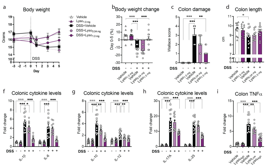 為了進(jìn)一步研究補(bǔ)充溶菌酶對腸道健康的有益效果,本文中研究者們評估了化學(xué)誘導(dǎo)(DSS誘導(dǎo))的輕度結(jié)腸炎中的結(jié)腸損傷。設(shè)置了兩種劑量(1.0mg和0.4mg)的溶菌酶。在體重方面,發(fā)現(xiàn)接受1.0mg溶菌酶在對DSS誘導(dǎo)的小鼠的有一定的保護(hù)作用(圖3a-b),而0.04mg劑量的溶菌酶雖然缺乏保護(hù)作用,但是仍能抑制腸道炎癥(圖3c-h)。研究者還在所有測量數(shù)據(jù)中觀察到一個高度一致的劑量依賴性趨勢(圖3a-h)。與對照組小鼠相比,1.0mg溶菌酶沒有引起結(jié)腸損傷或細(xì)胞因子水平的可測量變化,因此表明溶菌酶不影響健康小鼠的免疫穩(wěn)態(tài)(圖3c-h)。