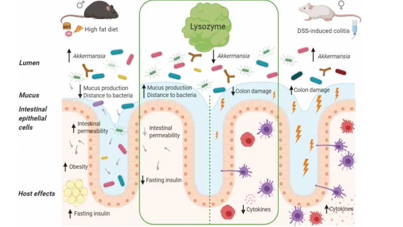 研究發(fā)現(xiàn)溶菌酶可劑量依賴性地減輕DSS刺激小鼠的腸道炎癥,可通過黏液的產(chǎn)生抑制HFD誘導(dǎo)的微生物群侵犯或易位,并可預(yù)防空腹高胰島素血癥。同時研究也發(fā)現(xiàn)溶菌酶保護(hù)腸道健康依賴于一些復(fù)雜的腸道菌群。